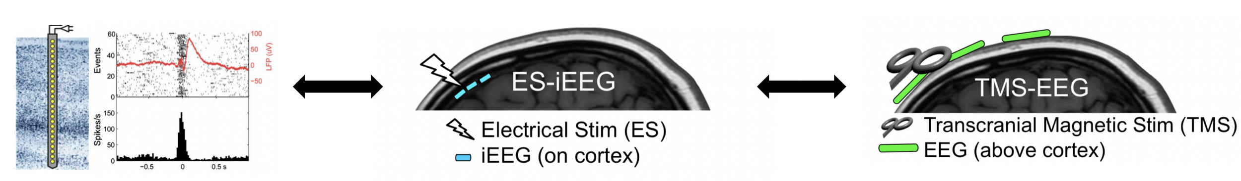 Figure 1: Methods used to probe brain activity in the lab. Left: microelectrode recordings allow single and multiunit neuronal measurements in humans and animals. Middle: combining human intracranial electrical stimulaton with intracranial EEG (iEEG) in epilepsy patients provides high spatial and temporal resolution but limited generalizability. Right: pairing TMS and scalp high-density EEG (hdEEG) in healthy controls and patients with psychiatric disorders provides generalizability but lower signal-to-noise.